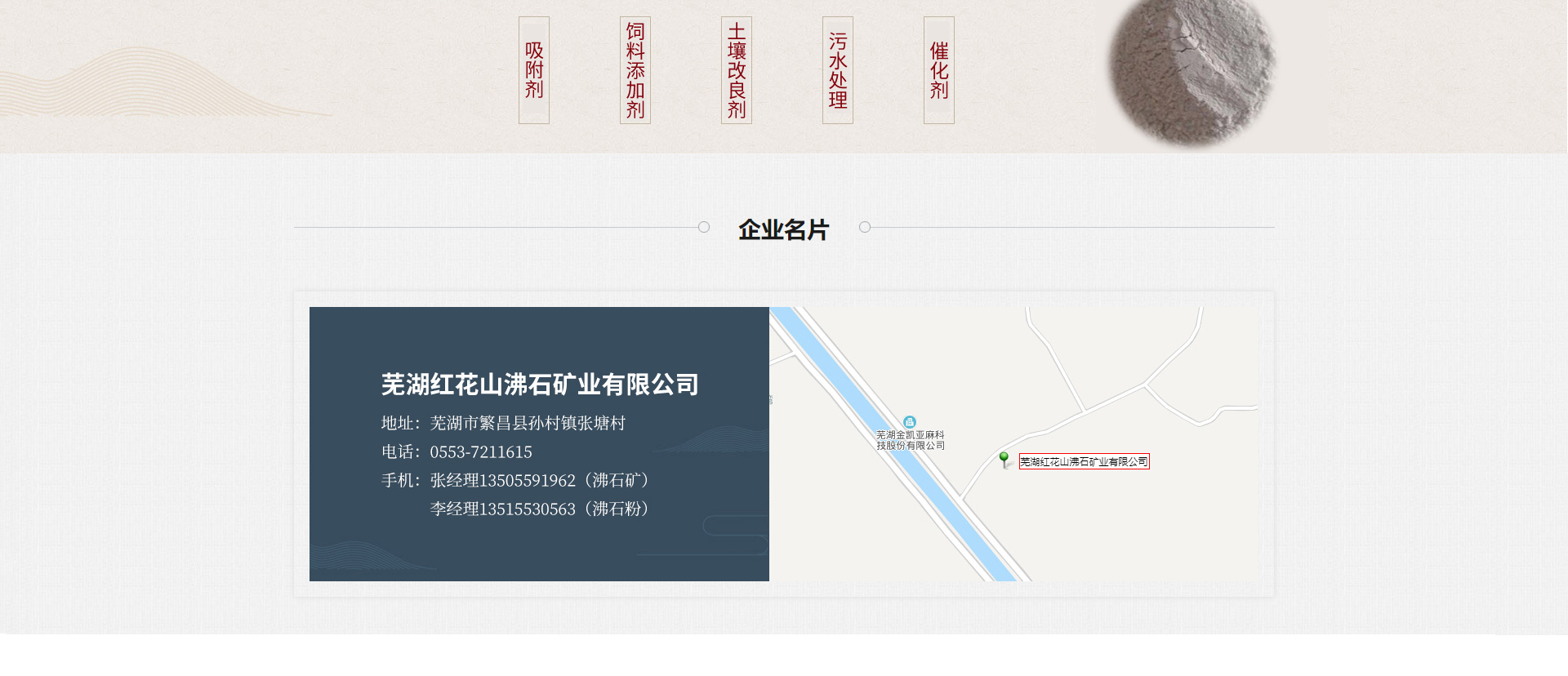 蕪湖紅花山沸石礦業(yè)有限公司距繁昌縣約18公里,有公路直達(dá)礦區(qū),距滬銅鐵路線的繁昌站、楓香墩站約20公里,礦區(qū)西側(cè)的赤沙河道直通荻港至長江,水路交通地理位置好。沸石是硅氧、鋁氧四面體構(gòu)成的架狀硅酸鹽,有較大的比表面積和孔體體積。我礦沸石經(jīng)321、803地質(zhì)隊勘探儲量約一億噸以上,主要為絲光沸石(Ca、Na、K2)【ALSi2O2】27H2O,此外還含有石英、蒙脫石等,經(jīng)合肥工業(yè)大學(xué)、蕪湖市科委、華東冶金地質(zhì)礦產(chǎn)研究所、南京地礦研究院等單位測試測定沸石含為55%—68%。